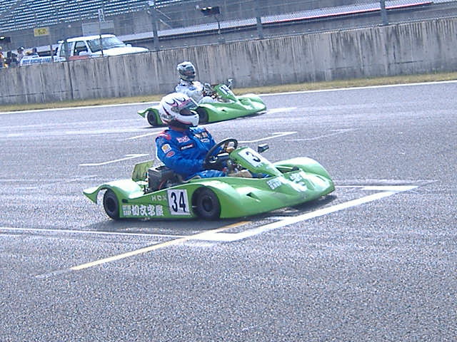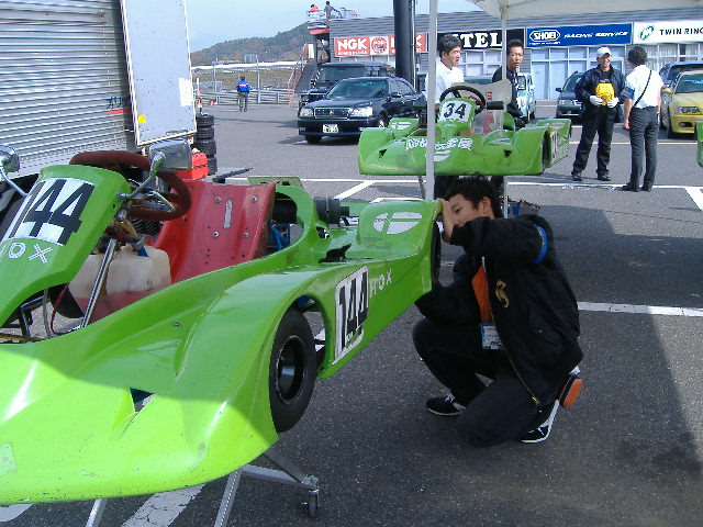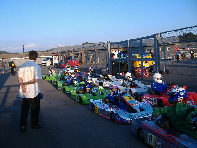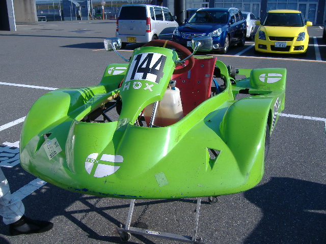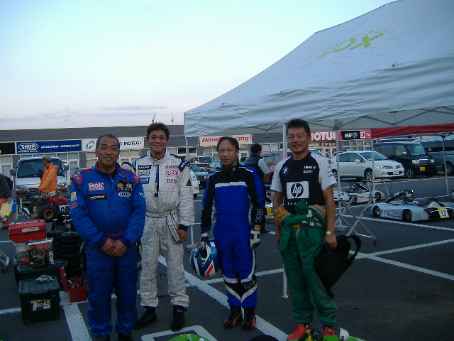 2010,11,7 HDX第5戦6戦 参戦までの道程 KARTでレース参戦を始めてからずぅ〜と燻ぶっていた思い・・・ 「KARTでF1等が走るRacingコースを走って見たい」 途方もない夢と諦めていた しかし 夢は叶うのだ!! 2010年9月某日 横浜辺りの電話番号から携帯に着信 「誰?」 出て見るとVICIC事務局の近江さんだ 「富士のRacingコースをKARTで走って見ませんか??」 「何と!?」 素直にビックリしました 「エッ!?33号車で??」 「いえ、レンタルマシンで」 良く話しを聞くとHDXと言うカテゴリーで健常者と身障者それに青少年まで含めてイコールコンディションの レースらしい 通常のKARTとの大きな違いは全ての操作を手で行うと言う事 レンタルマシンも有るとの事でそのマシンで出場してみないか??と言うことです しかもライセンスもHDX用のライセンスが用意されていて簡単に取得出来るとの事 確か・・・二つ返事で「出ます」と言った気がする 出場予定のレースはSUPER GTの予選日 2010年9月11日 「レースまで一週間しかない」 ネットを駆使してHDXなるものを検索して見た どうもエンジンはヤマハのKTでクラッチ付き フルカウル装備が普通らしい スーパーカートでフルカウルは知ってるが・・・ うーん・・・・どんなマシンだ?? 「まぁ見て見れば判るさ」などと、のんきな気分で練習日を楽しみにしていた 南海上に台風 まさか・・・ 何の心配もしてなかった 「最悪雨だなぁ・・・」 なんて思っていたのに、進路が急変!! FSWを直撃し、ご存知の集中豪雨でFSWも周辺も甚大な被害でレース中止 結局次の最終戦の茂木までレースは無いと言うことに・・・ 「茂木って栃木県だよなぁ・・・」「遠いなぁ・・・」 半ば諦めていました でも、楽しいレースなら来年は出場したいと思い茂木に行く方策を練っちゃいました 「誰かを誘おう!!」 と思った瞬間にターゲットは決まってました そう、あの有名なお祭り男、144Racingの日吉監督です 「HDXで一緒に茂木走らない??」 一瞬固まる日吉監督 「マジで!?」「少し考えさせて」 しかし、数日で決断「茂木に行こう!!」 チームは別でも思いは同じです 「Racingコース走りたい」 そして来年度の活動指針も考えたい監督同士 レース一週間前にカートコースで知り合った蠍メンバー候補の高校生も加えて 何の苦労も無く茂木遠征部隊は結成された 茂木遠征敢行 2010.11.6 早朝AM3:00日吉監督と出発 三島で高校生の「周」と合流し東名・首都高・常磐道と高速を乗り継いでいざ茂木へ レース前日の6日に練習走行の枠があるので前日から茂木入り 茂木の東ゲートに到着したのはAM7:00ごろ 先着のVICIC事務局の近江さん野村君それに・・・見た事有る人だけど・・・ 後で名前と顔が一致しました 御大と言うか会長の今宮さんと挨拶を交しました 「茂木は寒い」朝6時の気温は3度だったそうです 初めて尽くしの茂木 冷たい空気で更に気が引き締まります レンタルマシンを積んだトランポが入ったので自分達もピットへGO これがHDXレンタルマシンの全貌 ライムグリーンのフルカウルにHDXのロゴがあしらわれてます しかしエンジンは確かにKT ここが一番難解な部分 手で操作するアクセルとブレーキ 左手がアクセルで右手がブレーキなんですね 事前にリサーチしてあったので頭では理解してたけど・・・ 目の当たりにするとまた緊張が高まります 「上手く扱えるのかなぁ・・・」と日吉監督 普段からメカニック兼務の自分は各部のチェック SECと聞いていたけどクラッチはSLじゃなくて以前から採用されてる湿式のクラッチ 「何故??」HDXテクニカルセンターの方に聞いて見ました 「乾式だと貼り付く事があるんです」 納得!! カートコースと違い全開に近い回転域をキープするRacingコースだからね! それに湿式は滑りが出るのでもしかしたらその滑りにも意味があるのかも?? 他は普段見慣れた光景のマシンです 意外だったのはフレームの剛性を上げてない点 その答えはコースインして知る訳ですが・・・ 練習走行 コースインは9:15 ビックリなのはスーパーカートも混走で練習だそうで・・・ 「速度差が80キロ以上あって危険なのでHDXはイン側キープで走行して下さい」と通達され・・・ 別の意味でも更に緊張感が高まります 「一歩間違ったら死ぬぞ!!」 気を引き締めてコースイン スーパーカートも混じり全車ピットロードでOPEN待ち KTの排気音なんぞ掻き消されるスーパーカートの排気音 「本当に大丈夫なのかぁ??」 心配を他所にゲートOPEN 左手を握り締めてアクセルオン ピットロードからコースへ 「ひっ!広い!!」 FSWのショートサーキットも広いと思ったけどスケールが違います コースもトレース出来て無いしラインも何もかも判らず前のマシンに着いて行くしかないと根性を入れて 1コーナーをクリアしたらフルスロットルと思ったら2コーナーとリンクする複合コーナーだった 「全くラインすら判らないじゃん」 おっかなびっくりしながら走るとピットが見えてきた 「ん?何で誰も居ないんだろう・・・」 後で判ったことですがそこはダウ